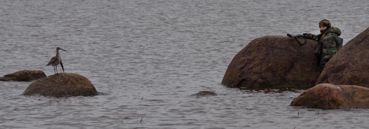 Утром 19 апреля в охотугодьях ЛООиР Керново, Финский залив, был убит Большой кроншнеп (Numenius arquata). Вид занесен в Красную книгу. Он летал вдоль берега прямо над охотниками, "обсвистывая" свою территорию с самого открытия сезона. Никому даже в голову не приходило стрелять по нему. 19-го приехал неадекват и сбил его. Подобрав подранка он не стал сразу добивать его, а посадил на валун рядом с собой. На мои маты в его адрес не реагировал. На фото браконьер и его жертва.