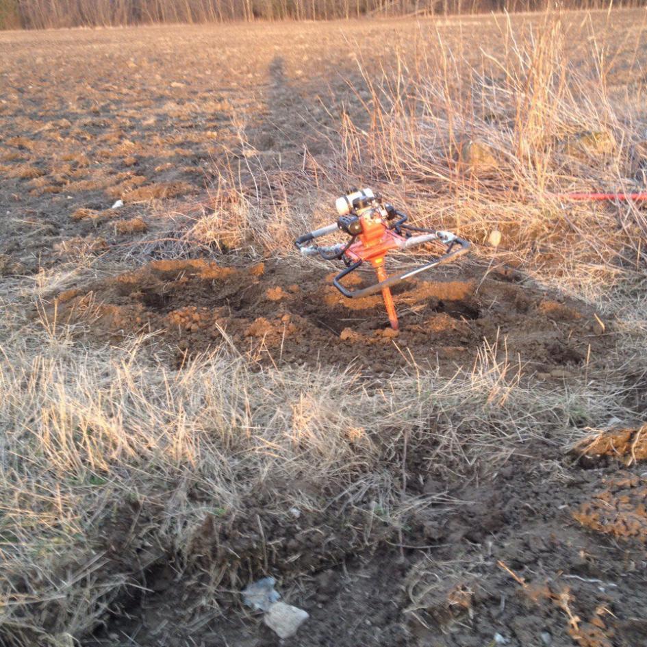 За пару дней до открытия поехали рыть яму на выбранном поле.Взяли в аренду мотобур (спасибо Славе за отличную идею), он очень здорово помог выбрать первые 0.7 метра грунта, а дальше были камни.