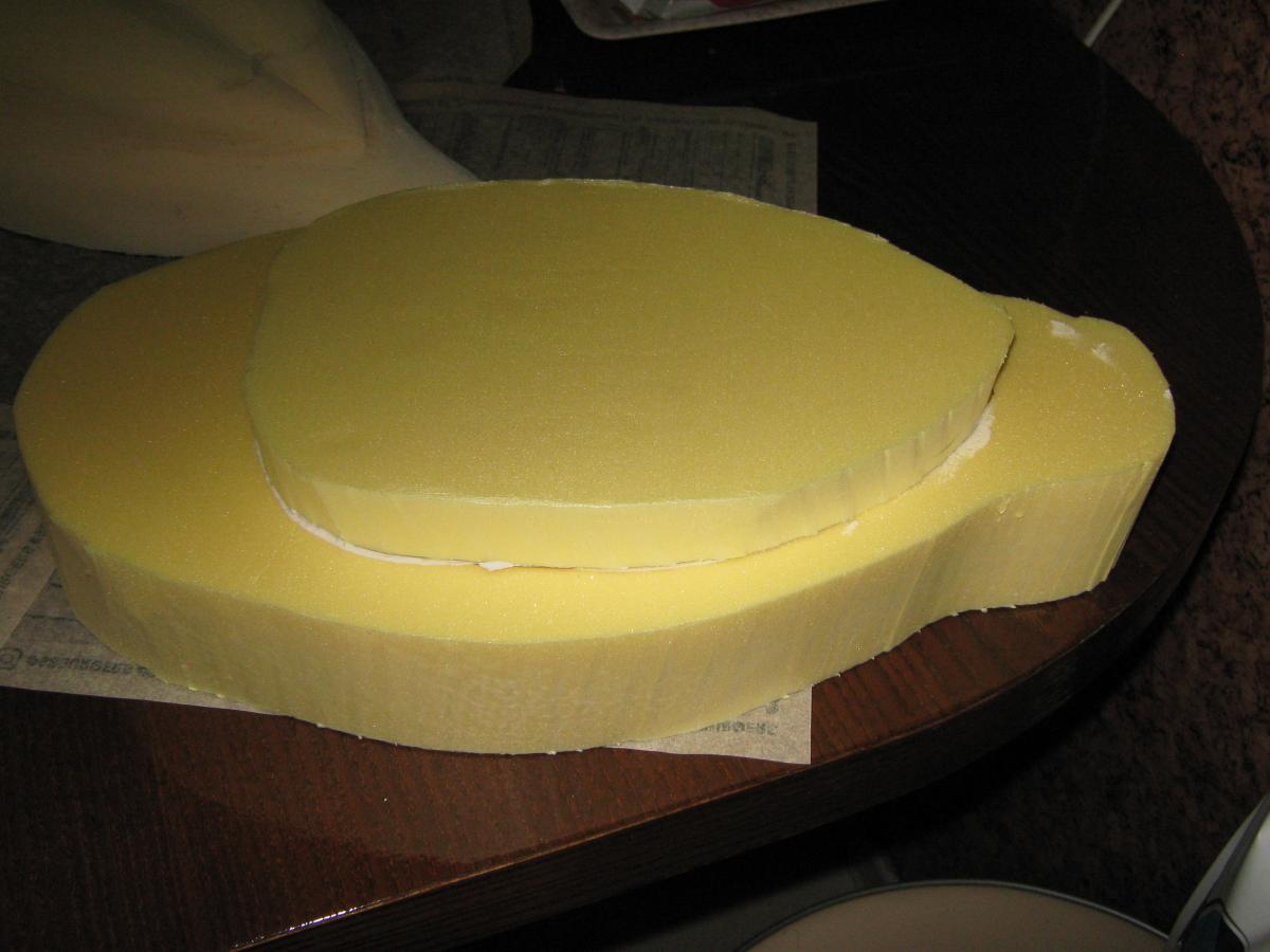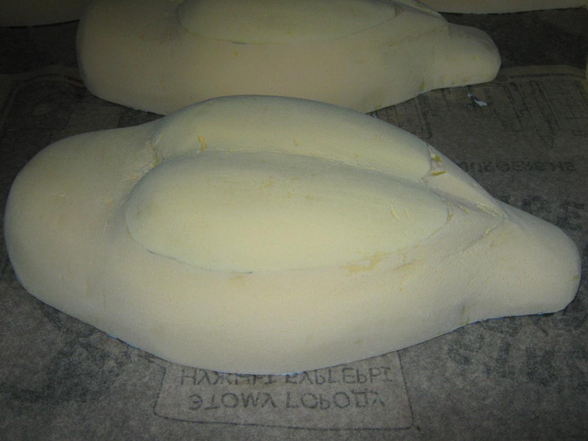 Ну вот ,первая серия.Склеенная заготовкаА это уже вырезанная ,ошкуренная и грунтованная тушка.Пригодна любая строительная проникающая грунтовка.Она необходима для обеспыливания перед шпаклёвкой и созданию хорошей адгезии.Следующий этап-шпаклёвка.Пригодна любая для наружных работ с хорошей адгезией и лёгкой шлифовкой.