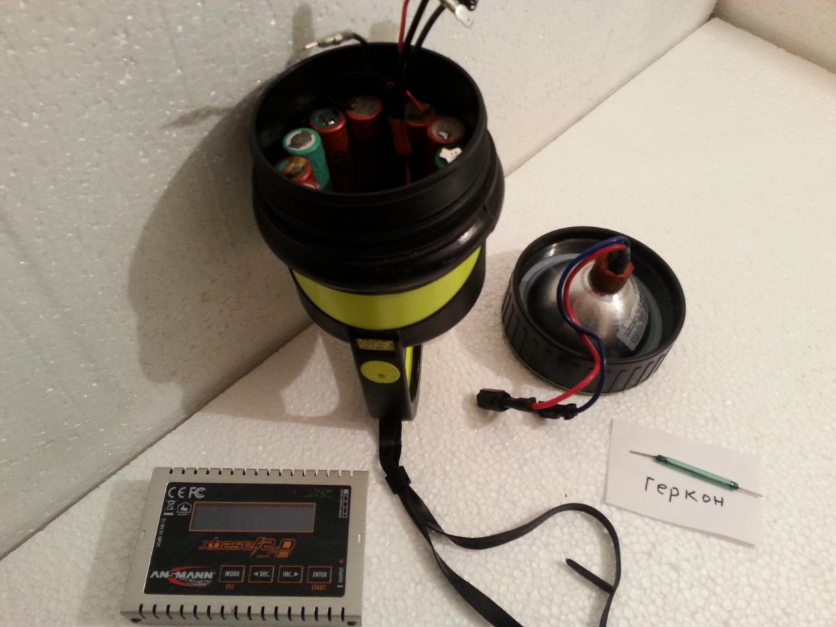 В широкоизвестный подводн батарейн фонарь Вега-2 можно встроить не только ксенон (блок розжига и лампу), но и современную АКБ на литии (12х18650). Ксенон 35Вт. 4300К. 3500Лм. 2часа свечения.
