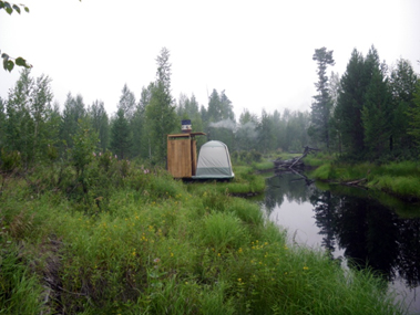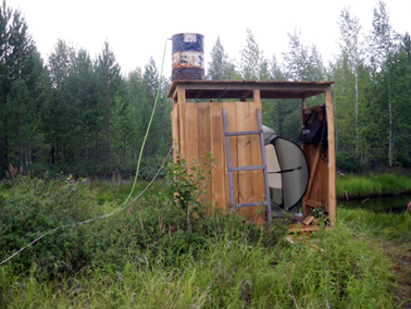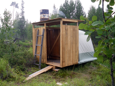 как-то странно всё. Дерево на душевую нашлось и время на постройку, а парилку в палатке делают . В чём глубокий смысл ? Я чаще другие варианты видел - если парилка в палатке, то душ или вообще открытый или брезентом/плёнкой затянут.Фото 24. Вид на душевую. Вода для душа насосом накачивается из р. Шаманка и поступает в бак емкостью 200 л (виден на фото); в течение 1-2 часов под воздействием солнечной радиации вода нагревается, после чего можно принимать душ (вода из бака поступает самотеком). Душевая электрифицирована.