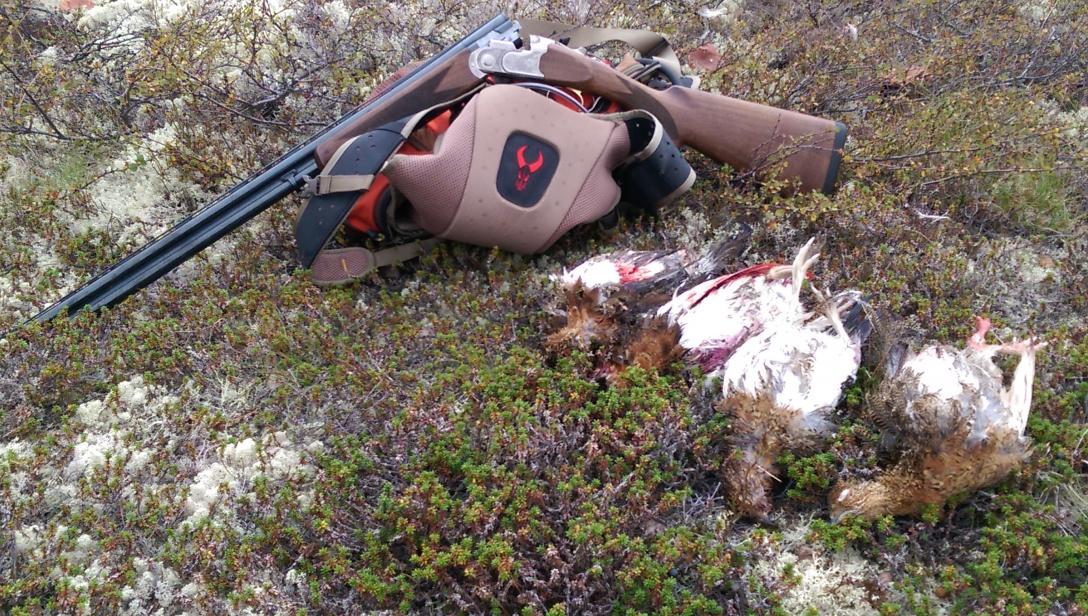 Первый выводок находим через час. Карамель сначала за ветром натыкается на птиц. Несколько взлетают. Но собака стоит. Подхожу заряжаю двустволку и совсем рядом с собакой из под ног вылетает еще друг за другом штук пять куропаток. Стреляю, первым горячусь- мимо. Вторым, выдохнув роняю куропатку метрах в 20. Карамель срывается и мутузит сбитую птицу. Есть первая куропатка в Заполярье.