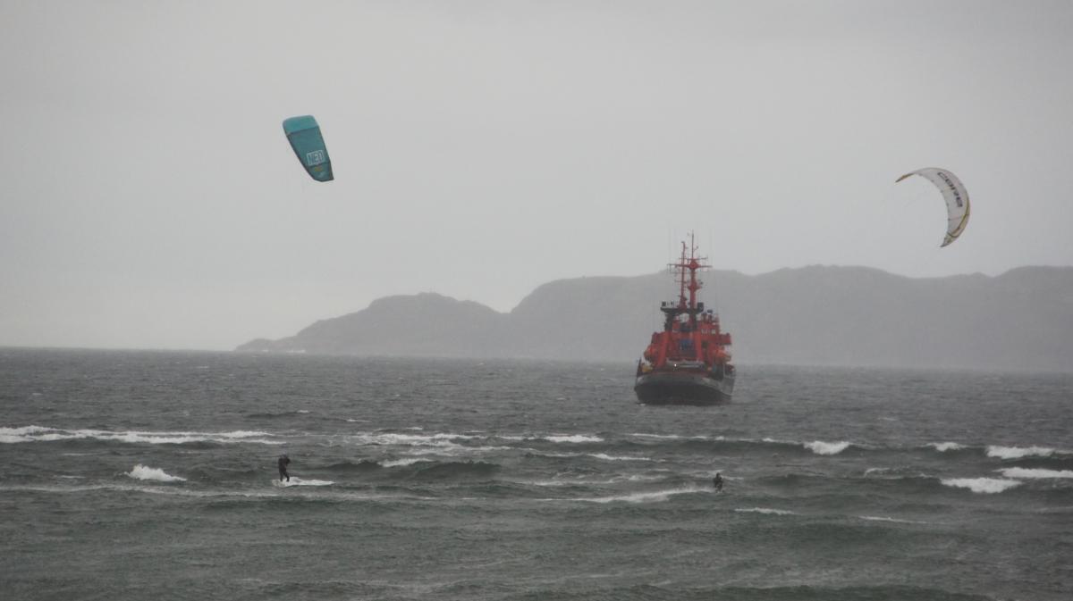 В один из вечеров сидя у большого окна и глядя на бушующее штормящее море ( в этот день порывы ветра доходили до 20 м/с) я вдруг увидел в море два паруса от кайтов.