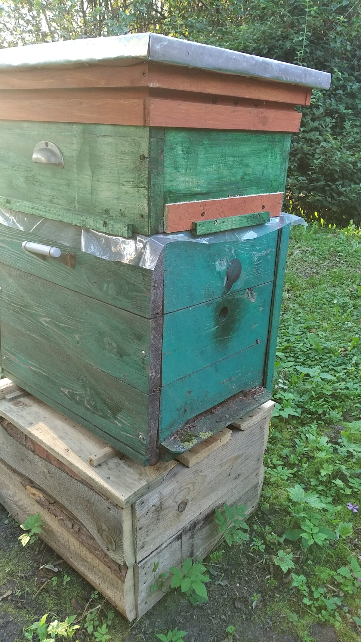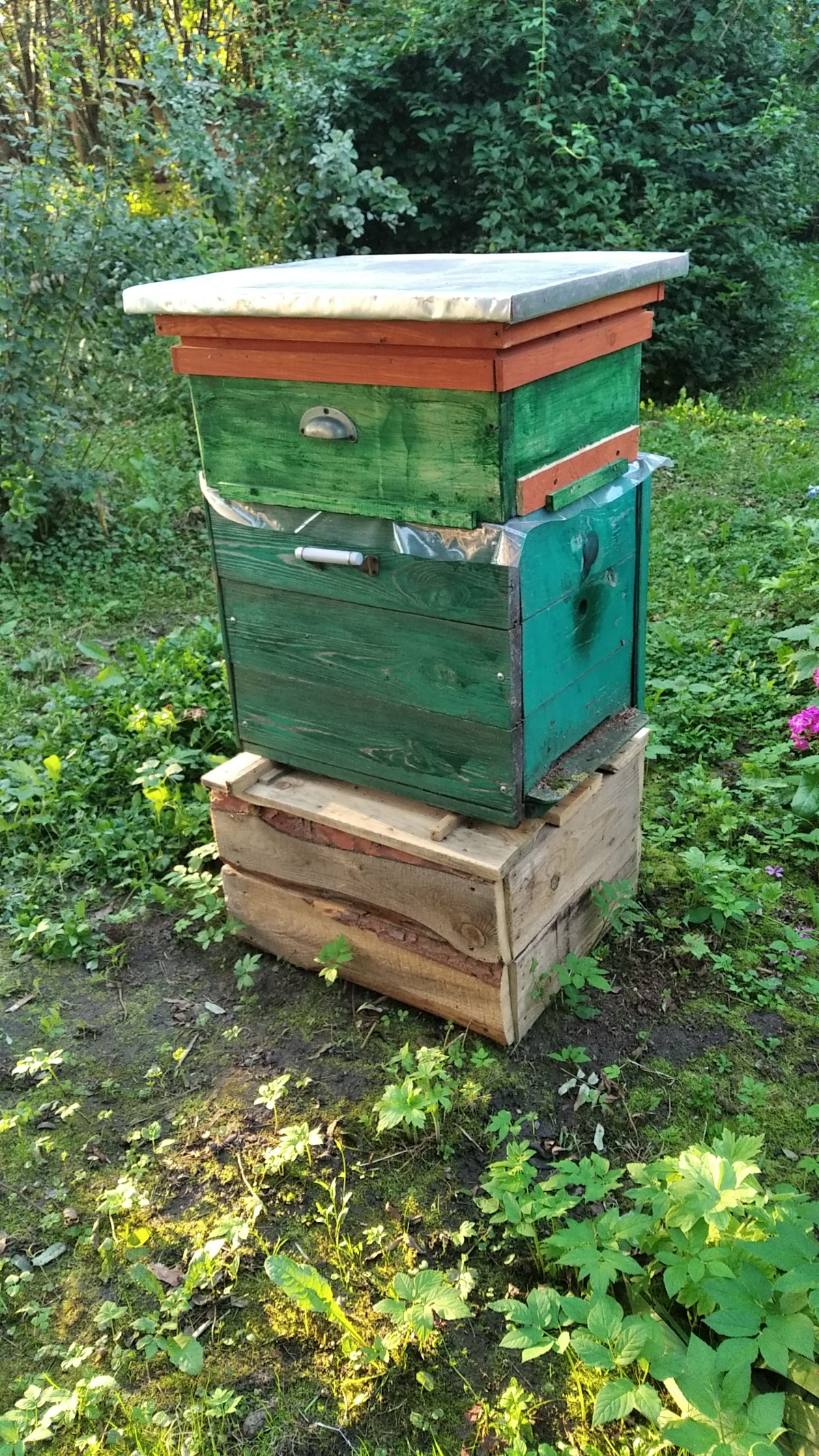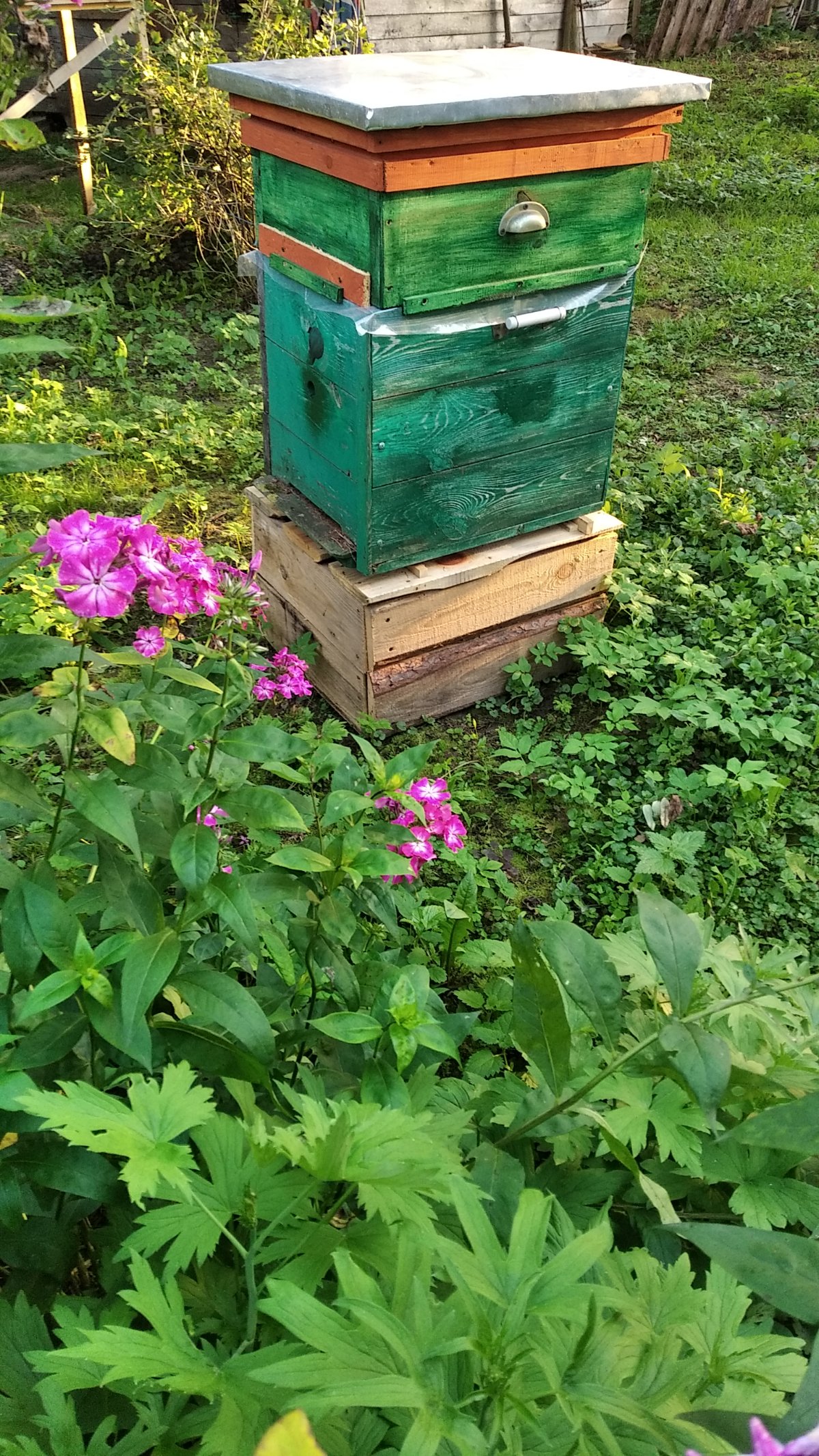 Дело в том, что я в этом году очень неожиданно стал пчеловодом. Лет 12 назад из обрезков половых досок смастерил улик декоративный. Естественно, сделал без особого соблюдения типоразмеров. Соорудил корпус. Правда, соорудил санитметров на семь выше стандартного, т.е. высотой около 37 см. В результате получилось гнездо на 8 рамок дадановских, которые я опустил к дну и над ними получилось пространство в семь лишних сантиметров. Положил холстик. Ну дно, естественно соорудил сплошное и крышу. Стоял этот улей в клумбе. Рамки в нём были без суши, без вощины и без проволоки - так, имитация, но любопытным можно было показать, как там внутри всё устроено.
