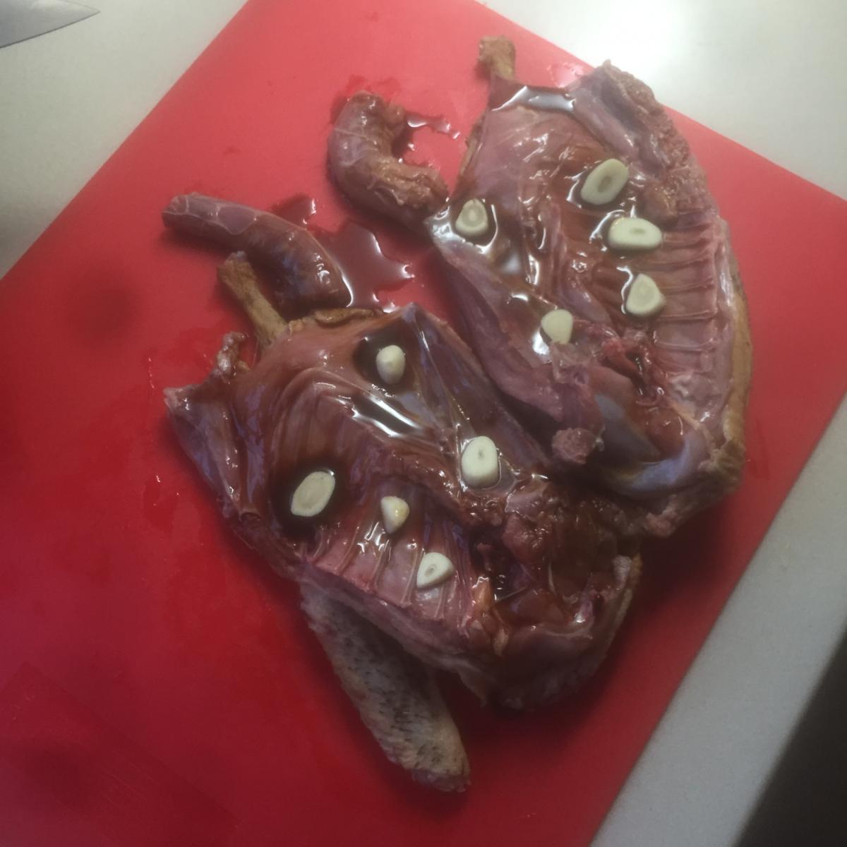 на эту подушку из овощей шкуркой вниз укладываем "главного гостя"! И заботливо укрываем остатками овощей.