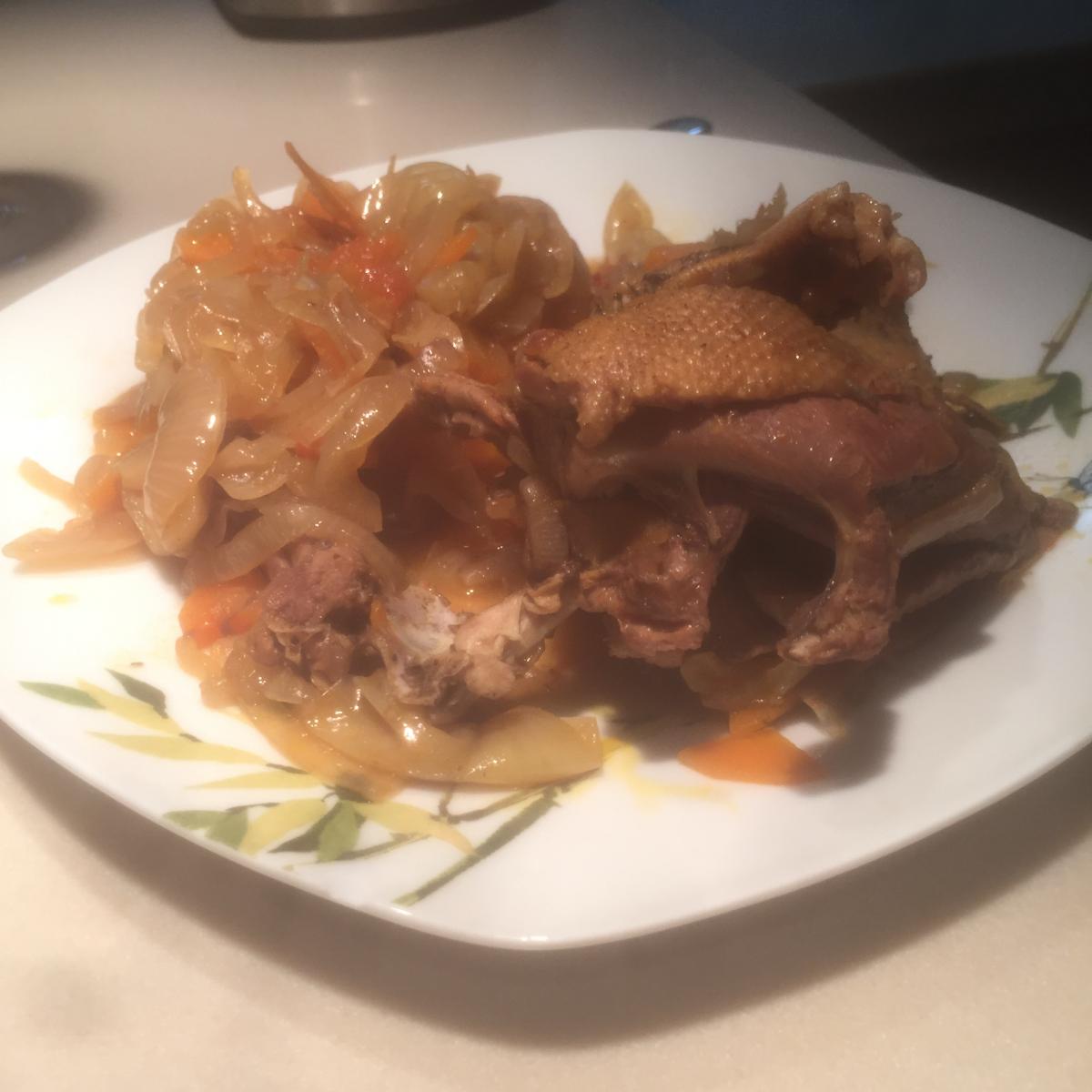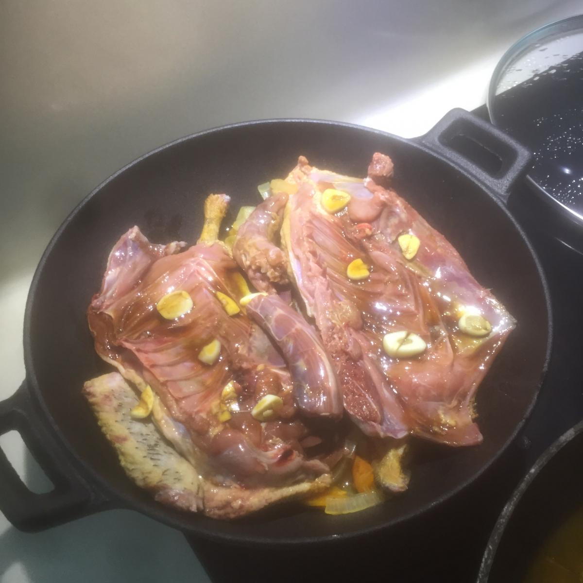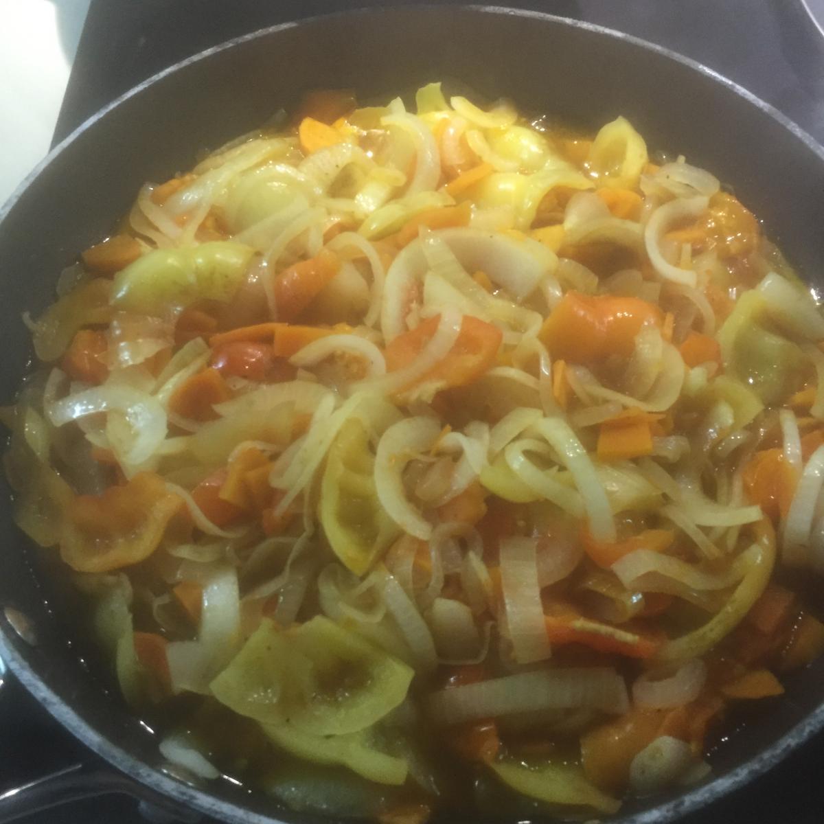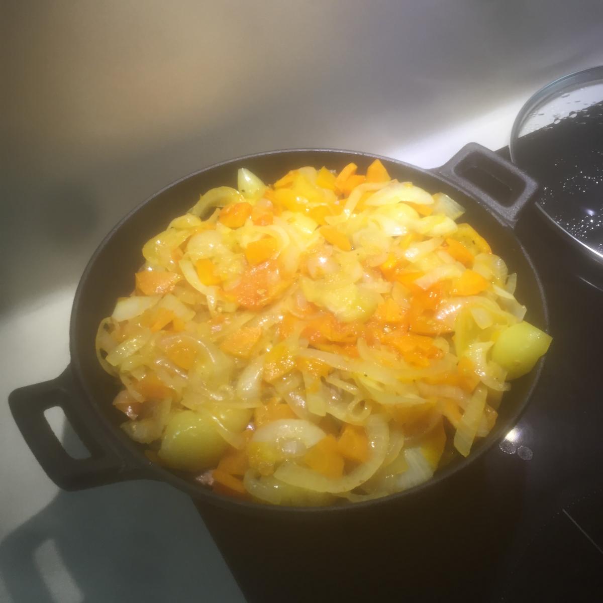 Пока птичка маринуется, овощи не мелко и не крупно порубать и в в сковородку с буквально КАПЛЕЙ оливкового масла, чуток черного перца и чуток соли. Кайф блюда именно в том, что оно в собственном соку овощей и дичины.
