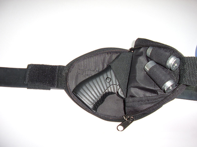 Сумка-кобура выглядит как обычная поясная сумка, а это значит она не провоцирует и не нервирует людей вокруг (как открытая кобура), даже если вы снимите верхнюю одежду. В тоже время она надежно фиксирует оружие и быстро раскрывается, движением одной руки за широкую липучку, тут же позволяя выхватить оружие второй рукой. Оружие при таком способе ношения не вываливается и не мешает.