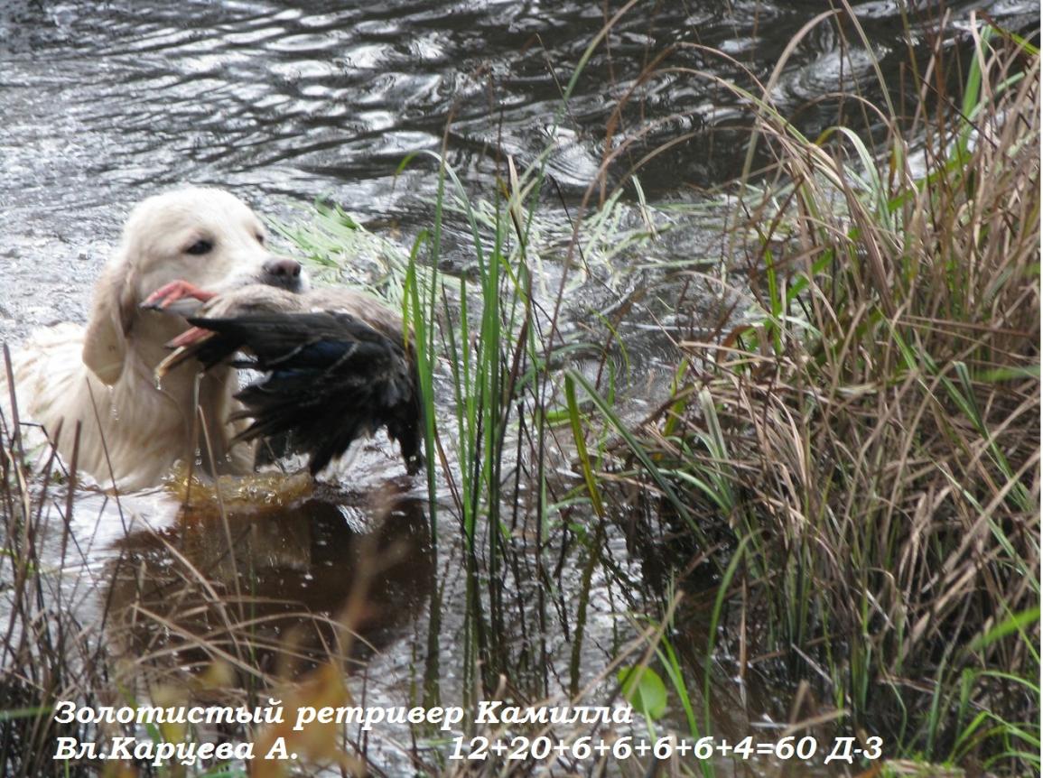 25 сентября Секцией ретриверов ККОС "ЛООиР" были проведены последние в этом сезоне испытания ретриверов по розыску и подаче. В испытаниях приняли участие 5 собак, в том числе и наши гости из Эстонии - ретриверы Татьяны Заморской. Для подачи с воды использовались утки, для подачи с суши - утки и перепела, что дало возможность проверить как чутье собак, так и знаменитую ретриверскую "мягкую хватку". Практически все собаки отлично находили и подавали перепела - не мяли и не жевали. По результатам выданы три полевых диплома: один - 1 степени и два - третьей степени. Голден Dutch Consolidation Quadrille (Кайзер), вл.Заморская Т., получил Д-1: 18+31+6+7+7+8+5=82 балла. Флет Blue-Blooded Captain Basteta (Нео), вл. Заморская Т., получил Д-3: 18+26+6+10+6+6+2=74 балла. Голден Камилла, вл. Карцева А., получила Д-3: 12+20+6+6+6+6+4=60 баллов. Поздравляем и ждем на наших полевых мероприятиях в следующем году!