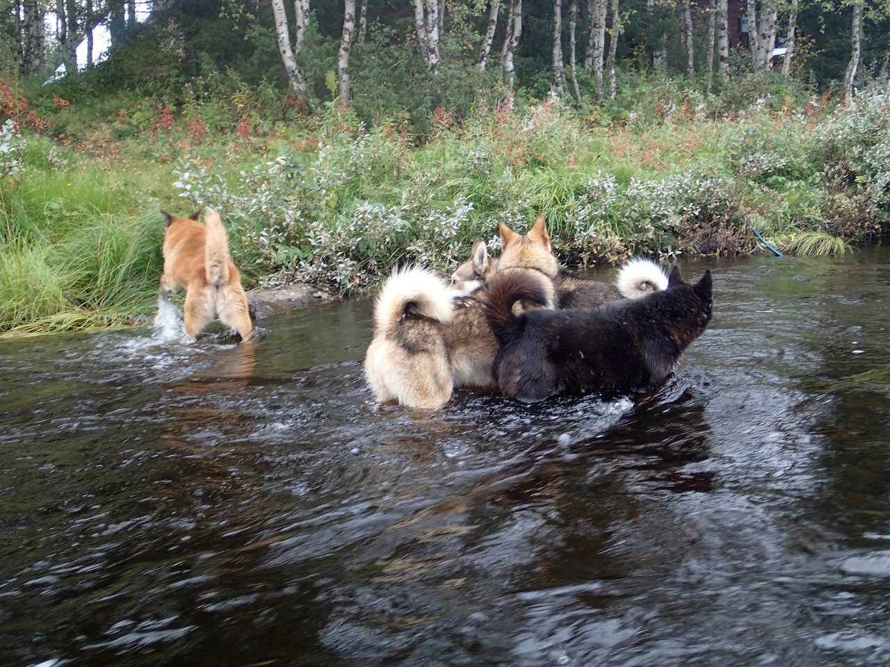 В месте, где в Цагу впадает р. Олонга стоит Куокса. Место там красивое, в наличии пороги и рыбные ямы. Которые впрочем были подвыбиты. Тут мы сделали остановку. Ваня ловил рыбу, а я пошел на лай Ермака. Пес нашел куницу.