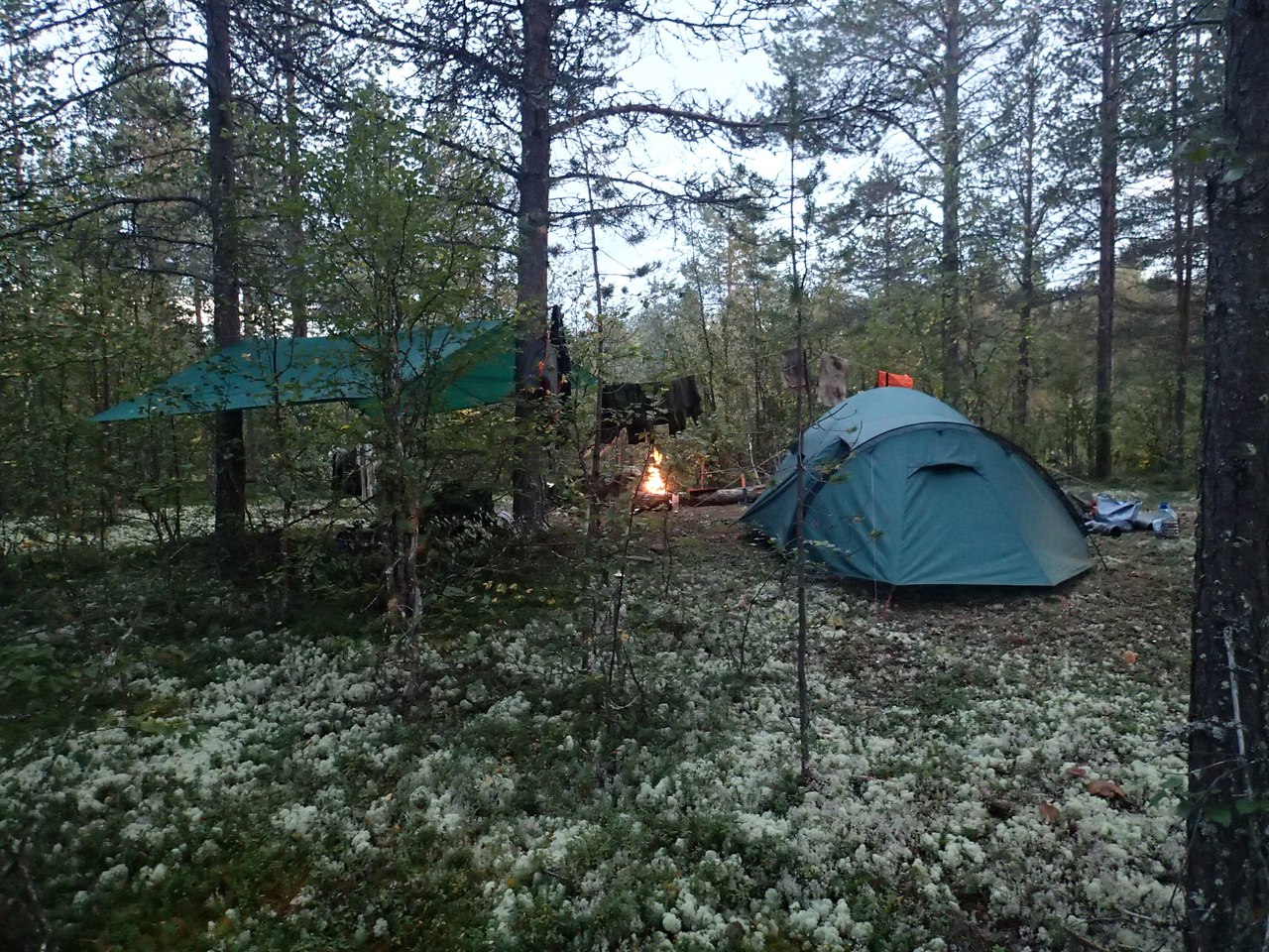 Доскр****** до места выбранного под лагерь. Это берег ручья на краю острова с лесом. Дрова тоже были в наличии. А так как дождь к вечеру стих, то мы еще устроили и просушку вещей. До Панских тундр было далеко, но с них доносился звук падающей воды. Водопады тоже были видны невооруженным взглядом.