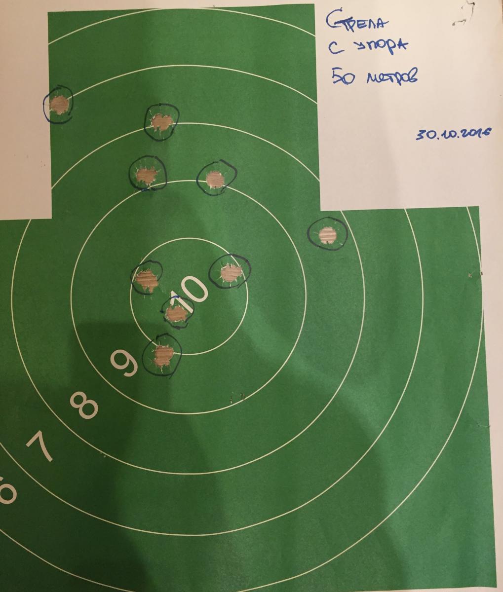 Приветствую! Скидываю результаты пристрелки 3 по счёту...подпиливал только мушку (была правее). Пристреливал в БСЦ. Жду Ваших приговоров). приклад длиный это я понял точно.