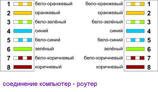Доброго вечера, задумал переставить руотер в другую комнату, чтоб лучше раздавал, купил 10 метров кабеля для подсоеденения компьютера к роутеру, подскажите , как правильно по цвету подсоеденить проводки кабеля к штеккеру?